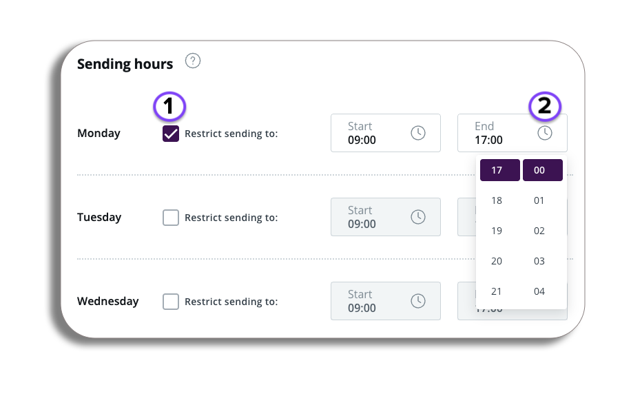 - To enable restricted sending hours for this account, enable sending hours for any of the days listed and select the hours where messages can be sent.