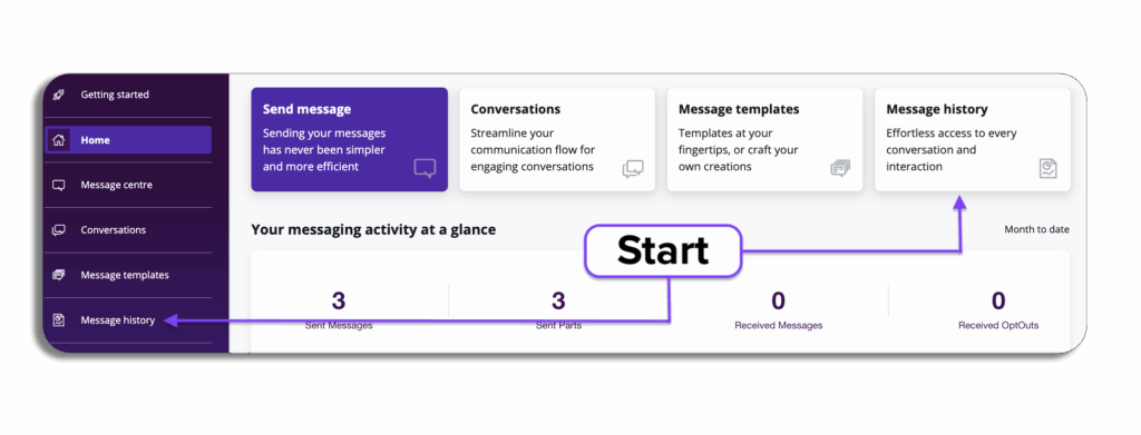 To access message history, navigate to the Message History section and select. You can also access the quick link on the homepage.