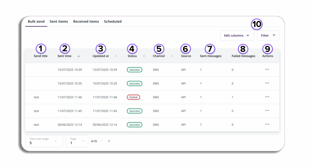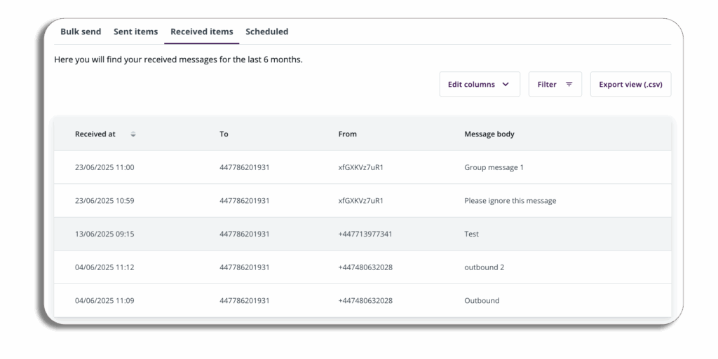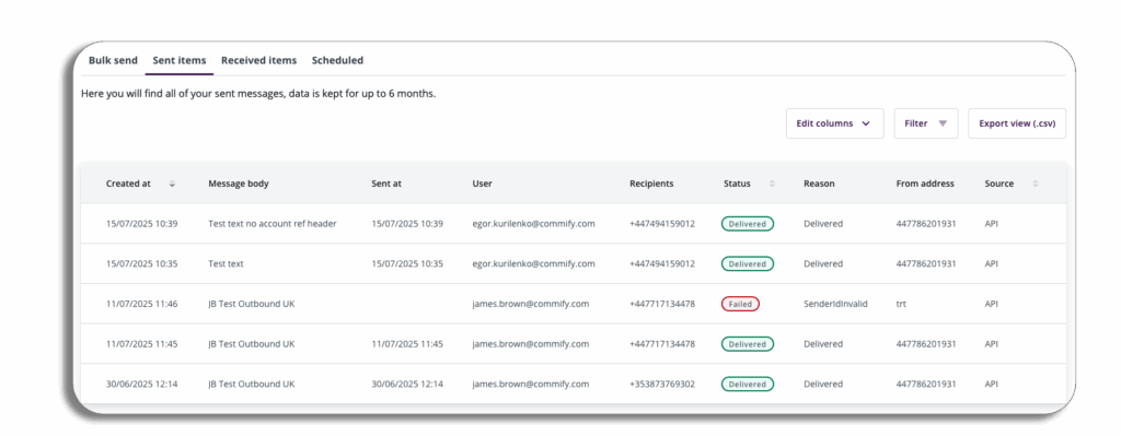 The Sent Items tab serves as a comprehensive record of all messages you have sent. Like the Bulk Send feature, it allows you to customize the display by editing columns, filtering search results, and exporting the data as a CSV file when needed. It’s important to note that the exported CSV will include any filters you have applied during your search, ensuring that the information is tailored to your requirements.