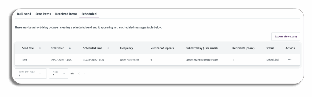 The Scheduled tab provides a comprehensive overview of all scheduled messages you have created. Selecting the actions button (three dots) you can edit the scheduled date, time and frequency of the message. You will be able to cancel any scheduled message as well.