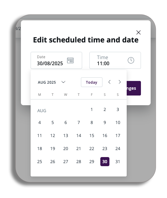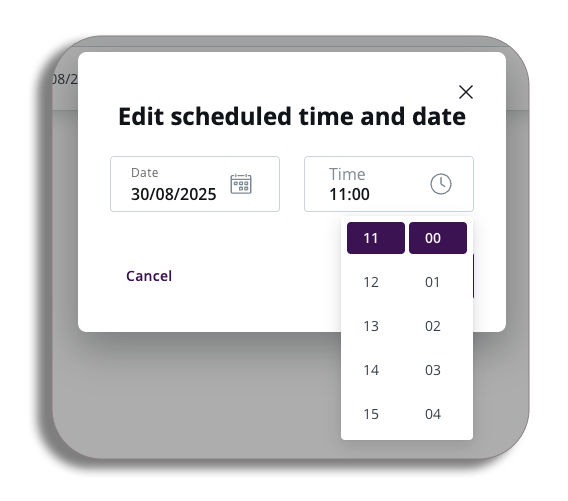 By selecting the edit option in actions you will get a popup which will let you amend the date, time and frequency of your message, once you have made your amendments, press save changes.