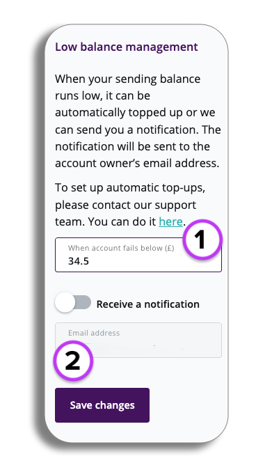 - Receive notifications sends an email to the account owner when the low balance has been reached.