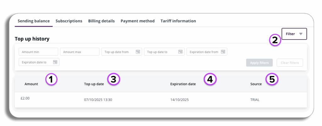 Sending balance is where you can top up your balance, share your balance with sub accounts and see your current balance. Let’s take a look around.