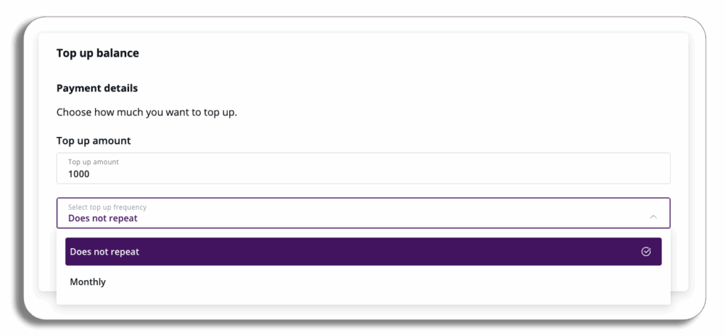 When you select top balance, you will be taken to a new screen where you will be able to enter the amount you wish to top up, and whether it is a one-off payment or a monthly payment.