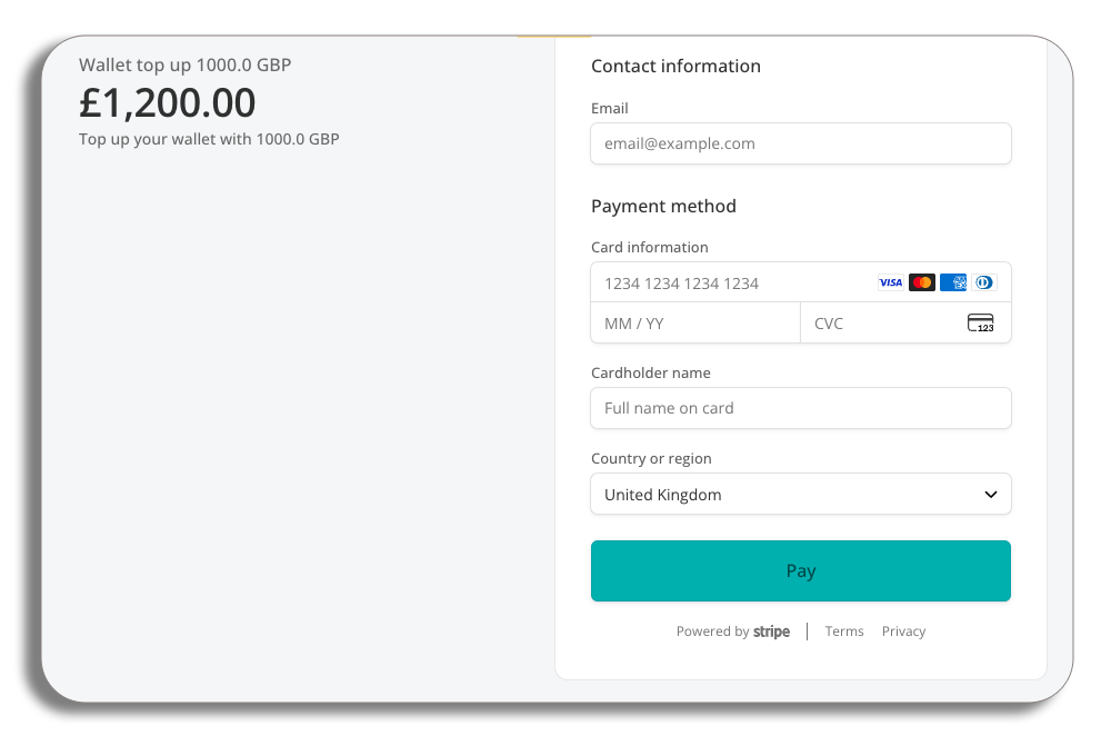On the payment page, you will have your final selected wallet top-up amount with the added VAT. You will just need to enter your email address and payment details, and then press pay