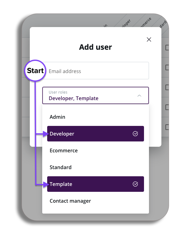 - Selecting Add User you will get a pop-up that you will need to add the new user’s email address and which user role you would like them to have, you will be able to add multiple roles to the user if required.