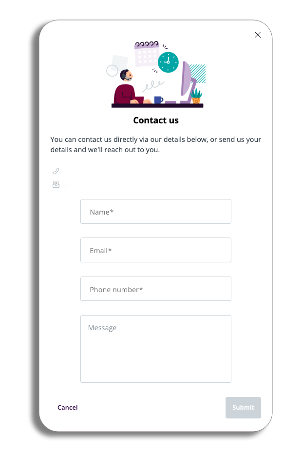 Here you will be able to submit a request to our support teams from the platform, you will also have contact details to get in touch via phone or email.